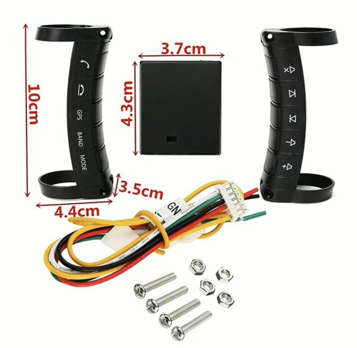 Bezdrátové ovladače na volant pro Android autorádia umožňují bezpečné a pohodlné ovládání všech hlavních funkcí bez nutnosti sundávat ruce z volantu. Sada obsahuje dva ovladače po pěti tlačítkách – jeden pro levou a druhý pro pravou stranu volantu. Díky bezdrátovému přenosu a univerzální kompatibilitě je instalace rychlá a jednoduchá. Ovládejte hlasitosť, přepínání skladeb, hovory nebo navigaci snadno a bezpečně – vše máte na dosah palce. Připojení k autorádiu probíhá pomocí vodičů KEY1 a KEY2, které zajišťují spolehlivou komunikaci s navigační jednotkou.