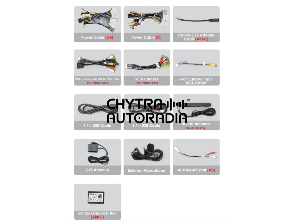 - Druh napájecího kabelu se určuje podle druhu továrního autorádia.