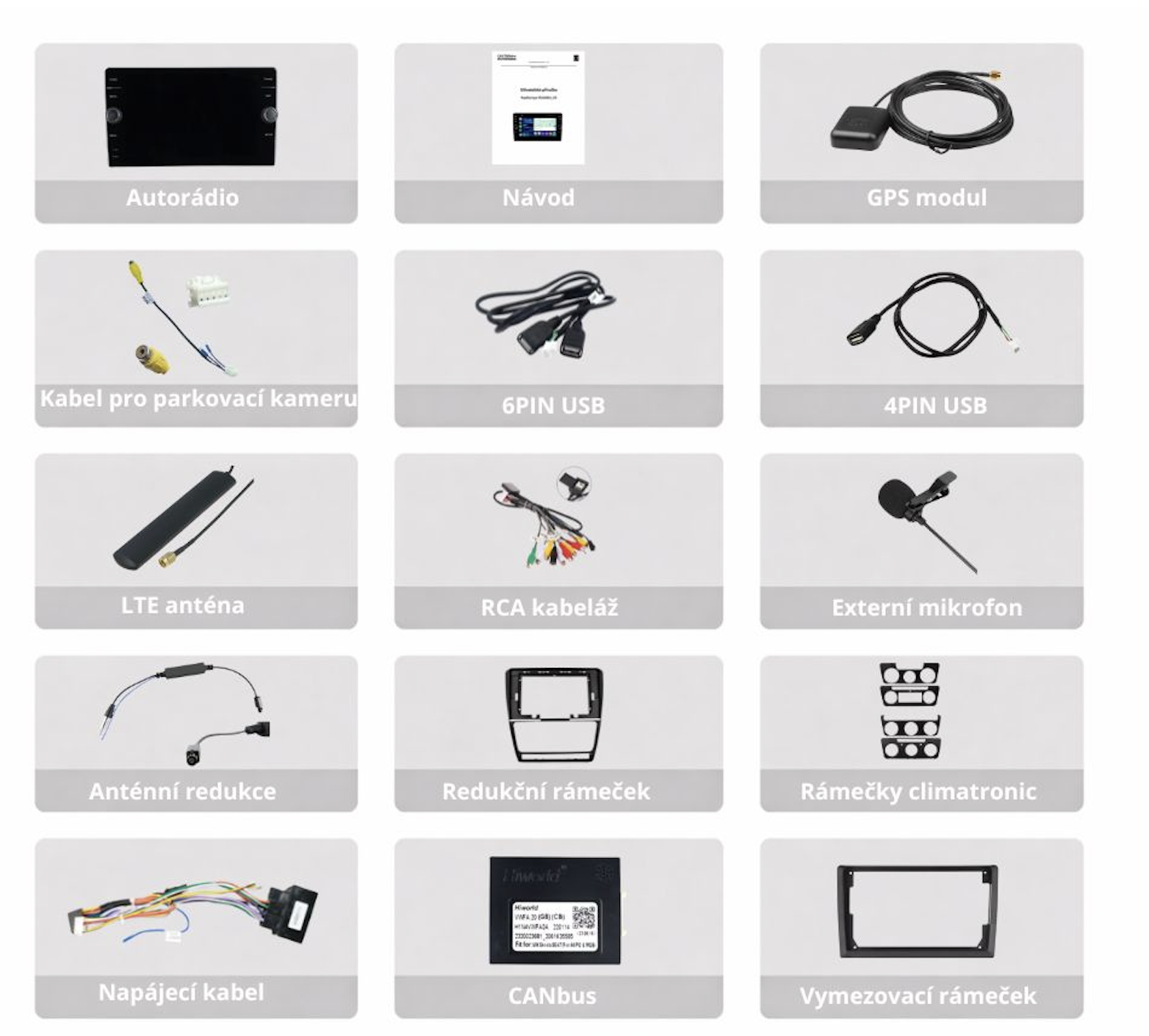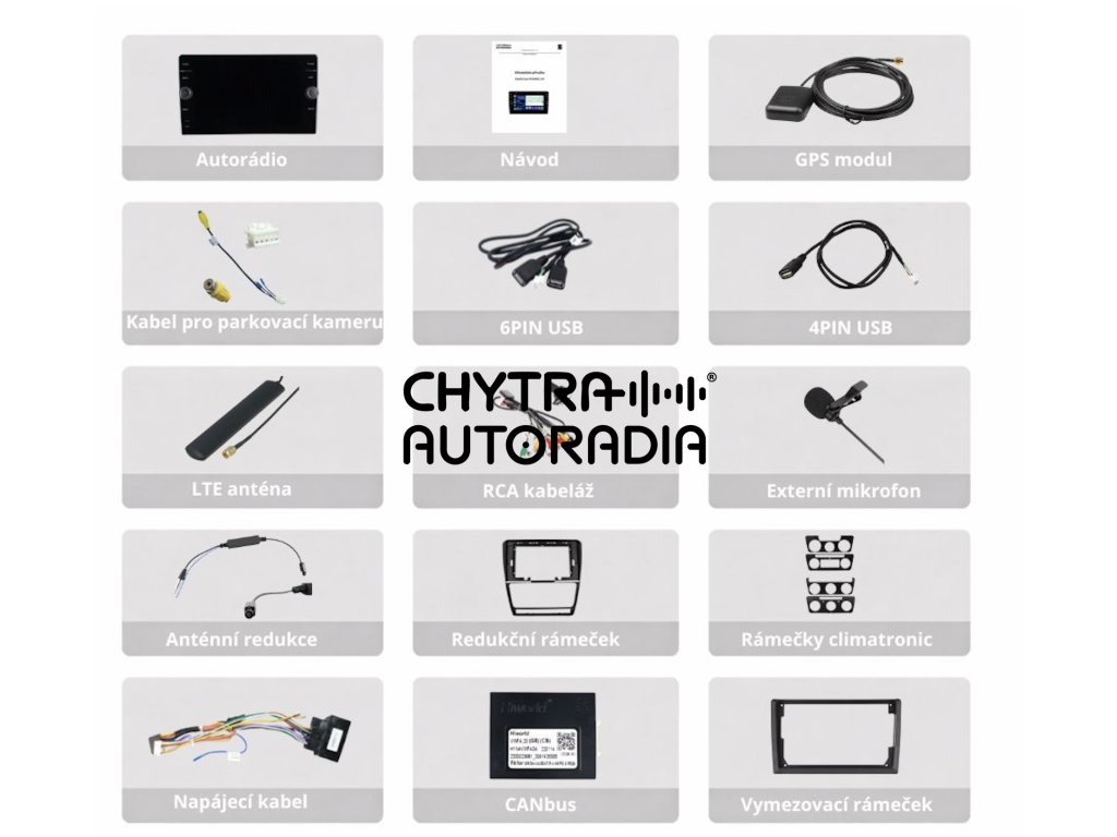 Součástí balení je CANbus dekodér, který po správném nastavení modelu vozidla v nabídce Factory Settings umožňuje autorádiu plnohodnotně komunikovat s řídicí jednotkou automobilu. Díky tomu jsou automaticky rozpoznány a funkční tlačítka na volantu, parkovací senzory i další systémová nastavení vozidla. CANbus zajišťuje plynulou integraci mezi autorádiem a elektronikou vozu, takže všechny originální funkce zůstávají zachovány a rozšiřují se o nové možnosti ovládání a zobrazení informací.