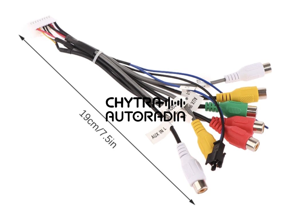 RCA kabeláž sloužící pro připojení subwooferu, externích monitorů, napájení zesilovače antény a externího mikrofonu u všech typů Android autorádií.
