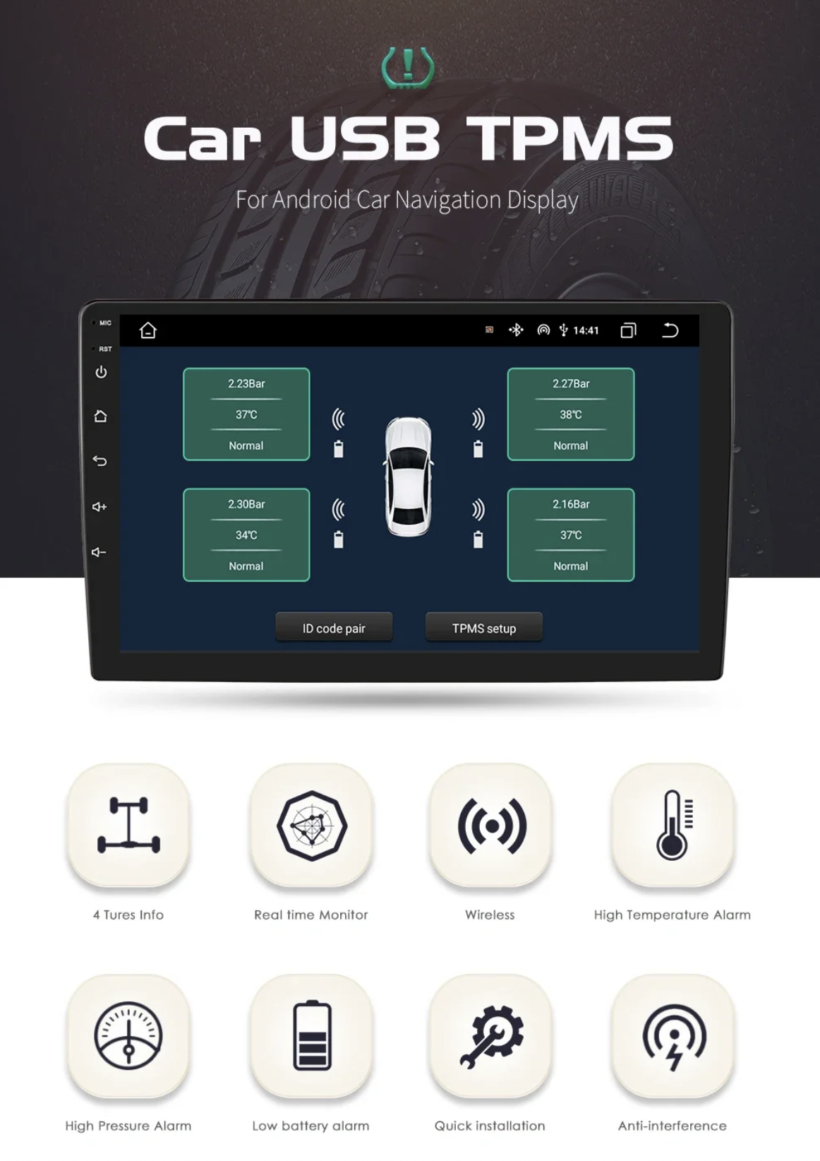 TPMS senzory pro Android autorádia umožňují pohodlně monitorovat tlak v pneumatikách přímo na displeji autorádia pomocí dedikované aplikace. Systém sleduje tlak ve všech čtyřech kolech vozidla v reálném čase, čímž pomáhá zvýšit bezpečnost jízdy, optimalizovat spotřebu paliva a předcházet nadměrnému opotřebení pneumatik. Senzory jsou integrované do čepiček ventilků, díky čemuž je jejich instalace velmi jednoduchá a rychlá, bez nutnosti zásahu do kol nebo použití speciálního nářadí.
