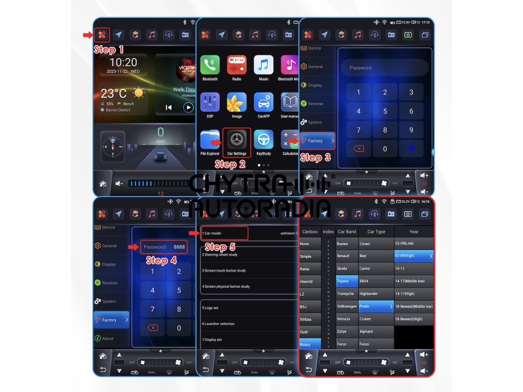Pro komunikaci autorádia s vozidlem je nutné nastavit model vozidla podle obrázku.